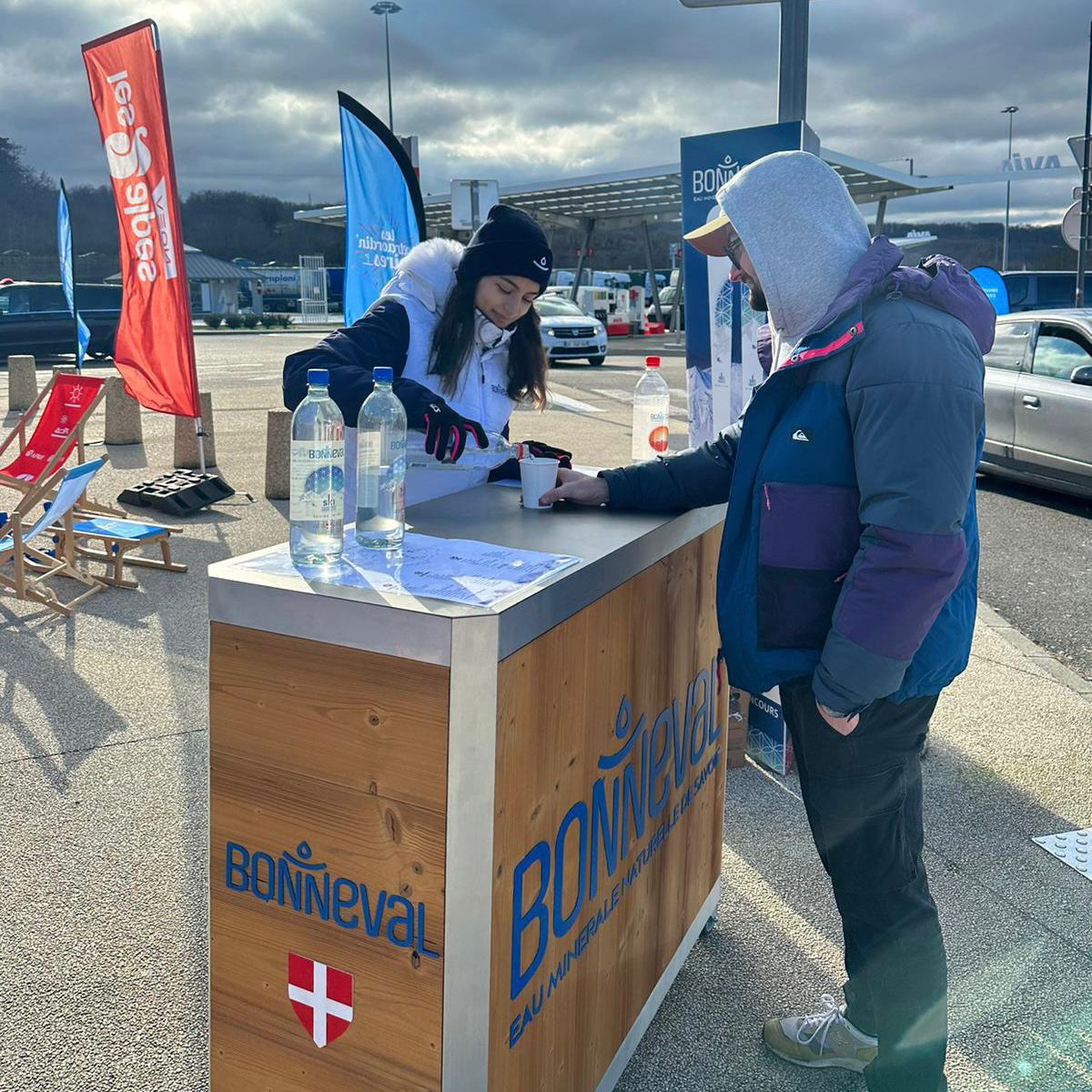 Récemment, l’agence a eu l’occasion de travailler pour la marque Bonneval Waters, en organisant une animation pour faire découvrir la marque sur différentes aires d’autoroutes en France. L’objectif de cette animation était de faire connaître la marque et ses produits, en proposant une dégustation de cette eau.