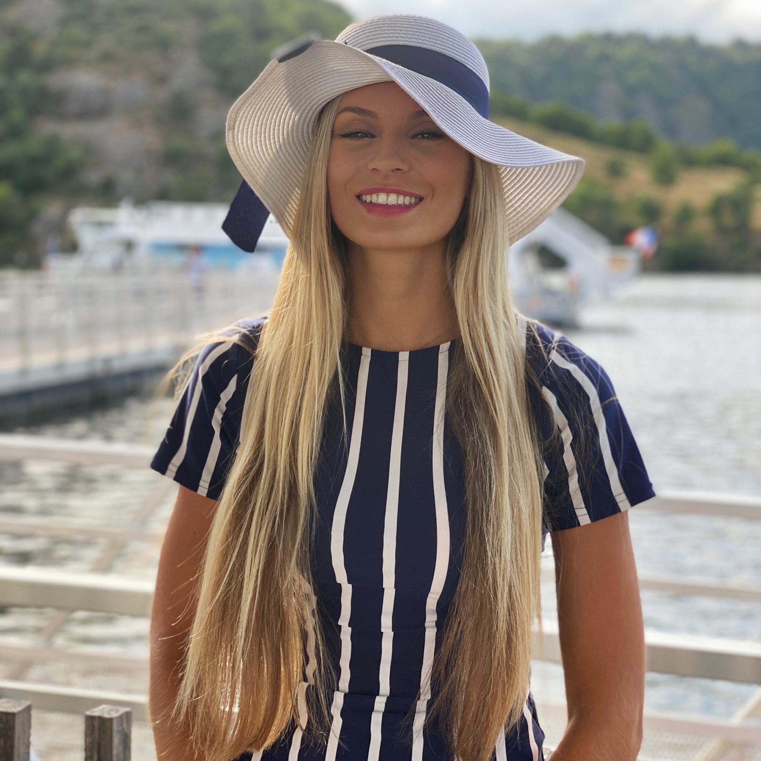 Notre charmante hôtesse Manon porte la Robe marine disponible pour tous vos événements !