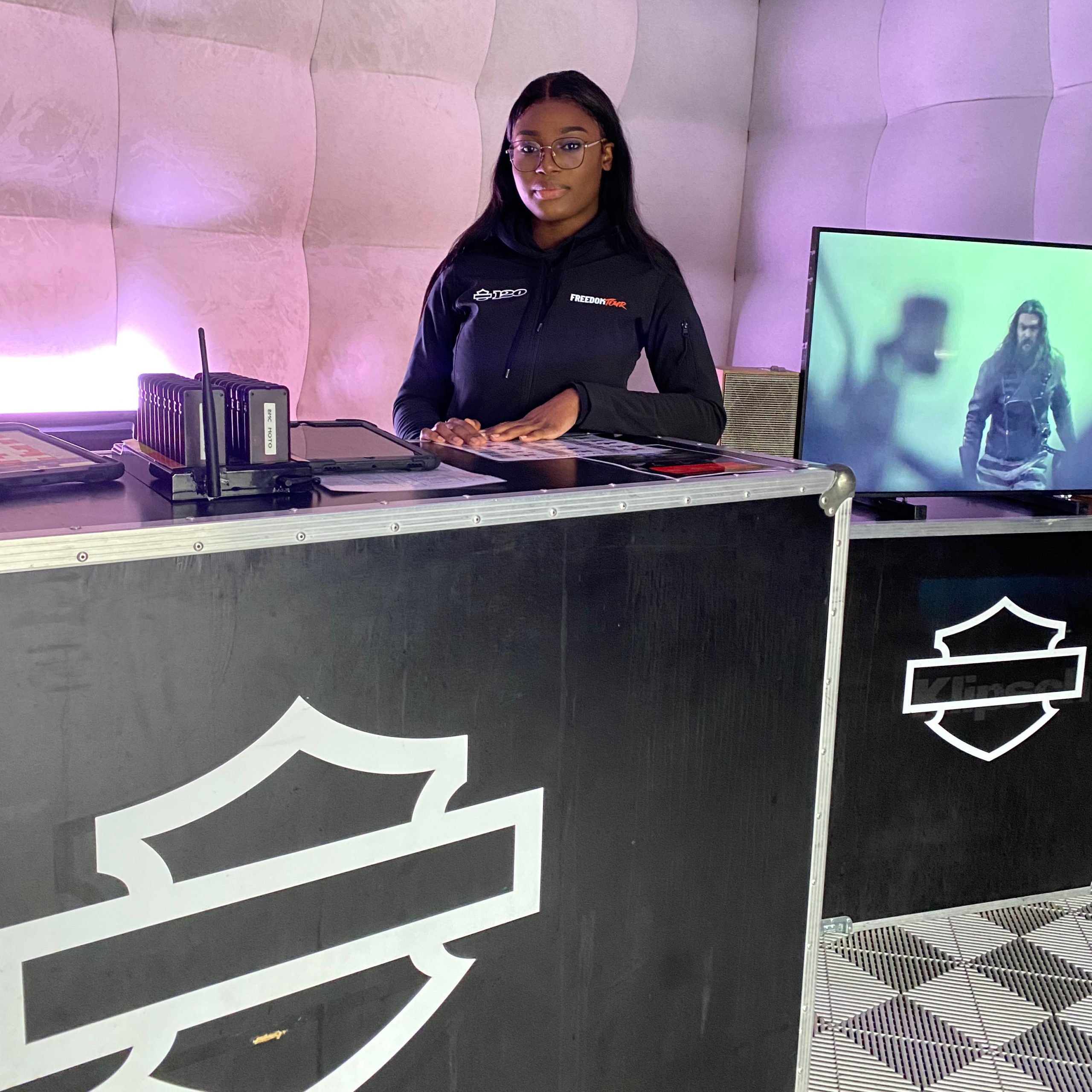 Notre hôtesse, Audrey, était en charge d’accueillir les participants tout en s’occupant de leur émargement. De plus, lors de cette tournée Harley Davidson propose des essais motos afin de découvrir la conduite à bord de ces véhicules. Audrey a donc encadré cette animation.